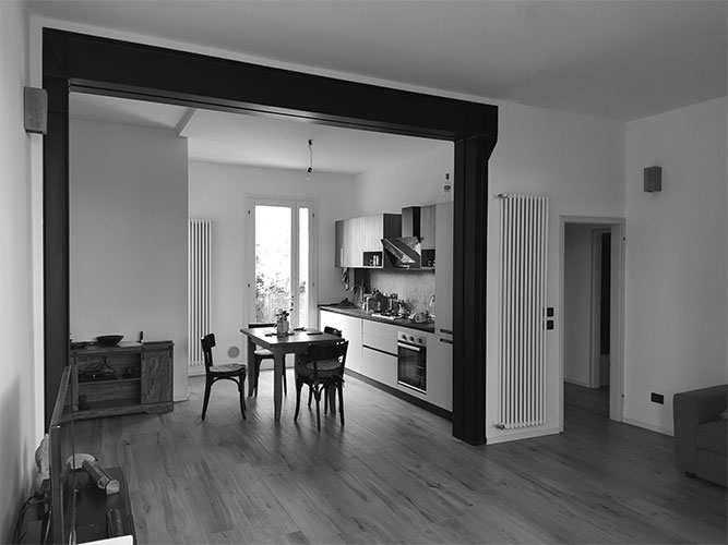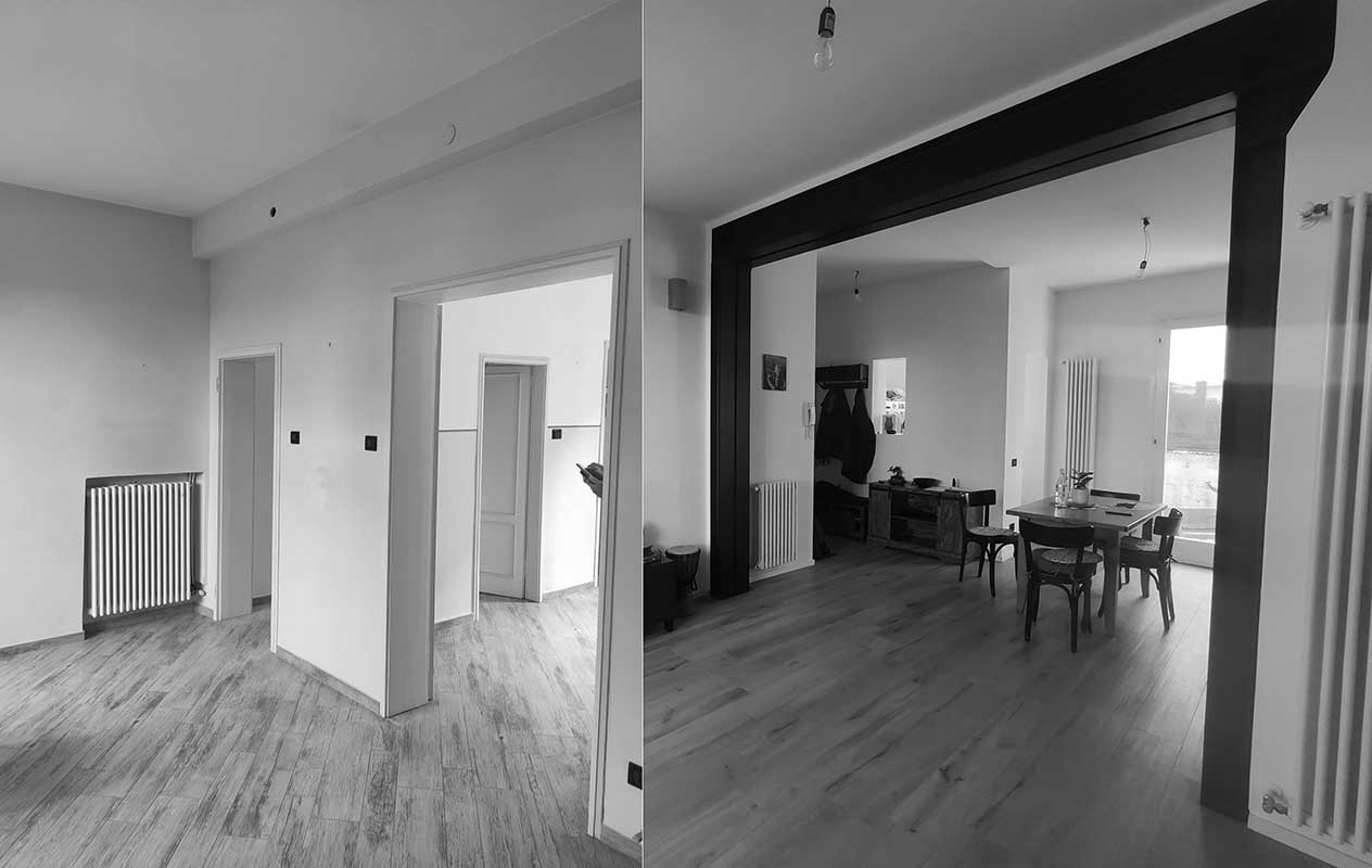 L’intervento ha previsto la realizzazione di un portale che ha permesso una zona giorno più ampia e libera dai divisori all’interno di un appartamento a Vicenza.